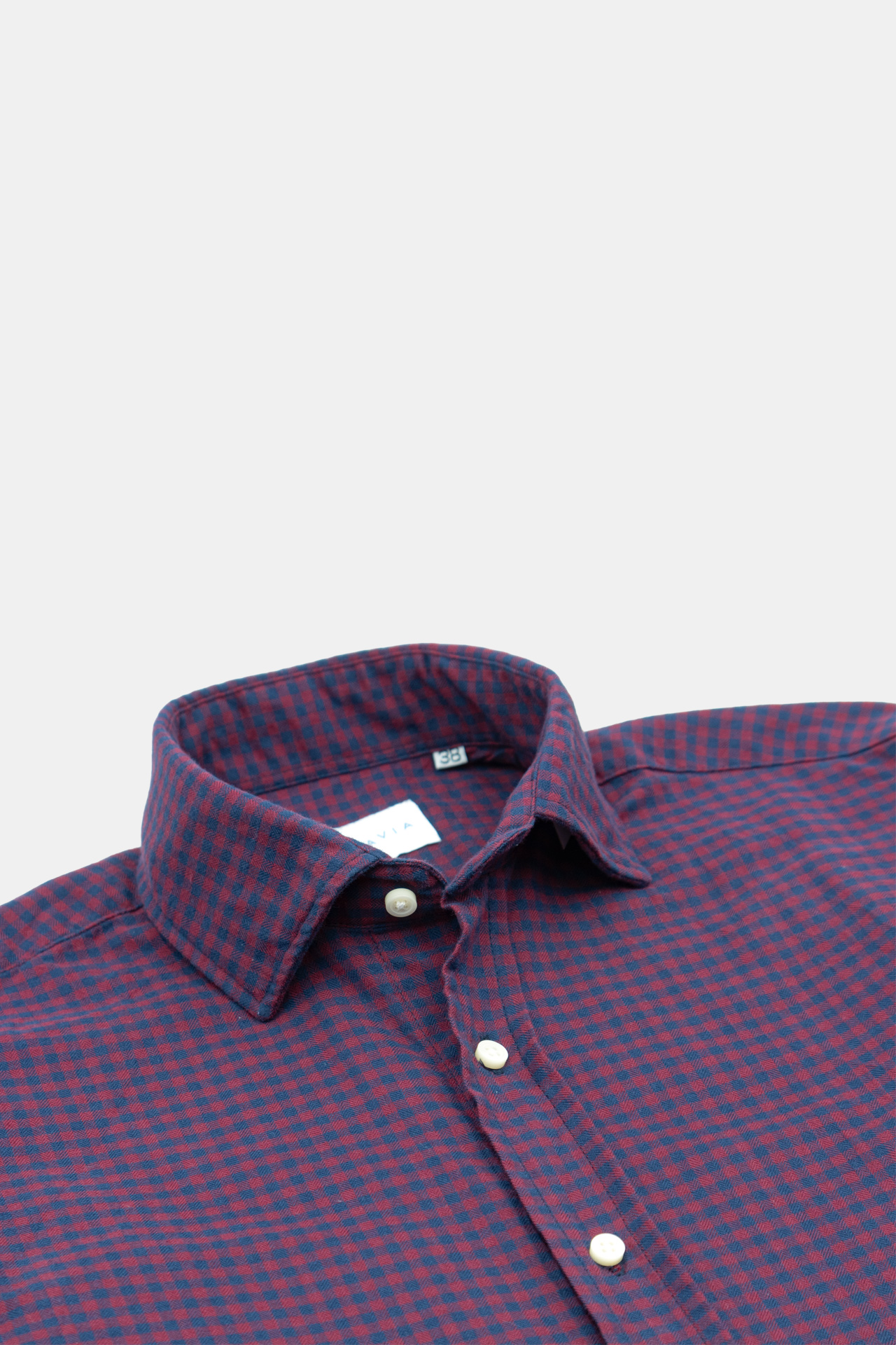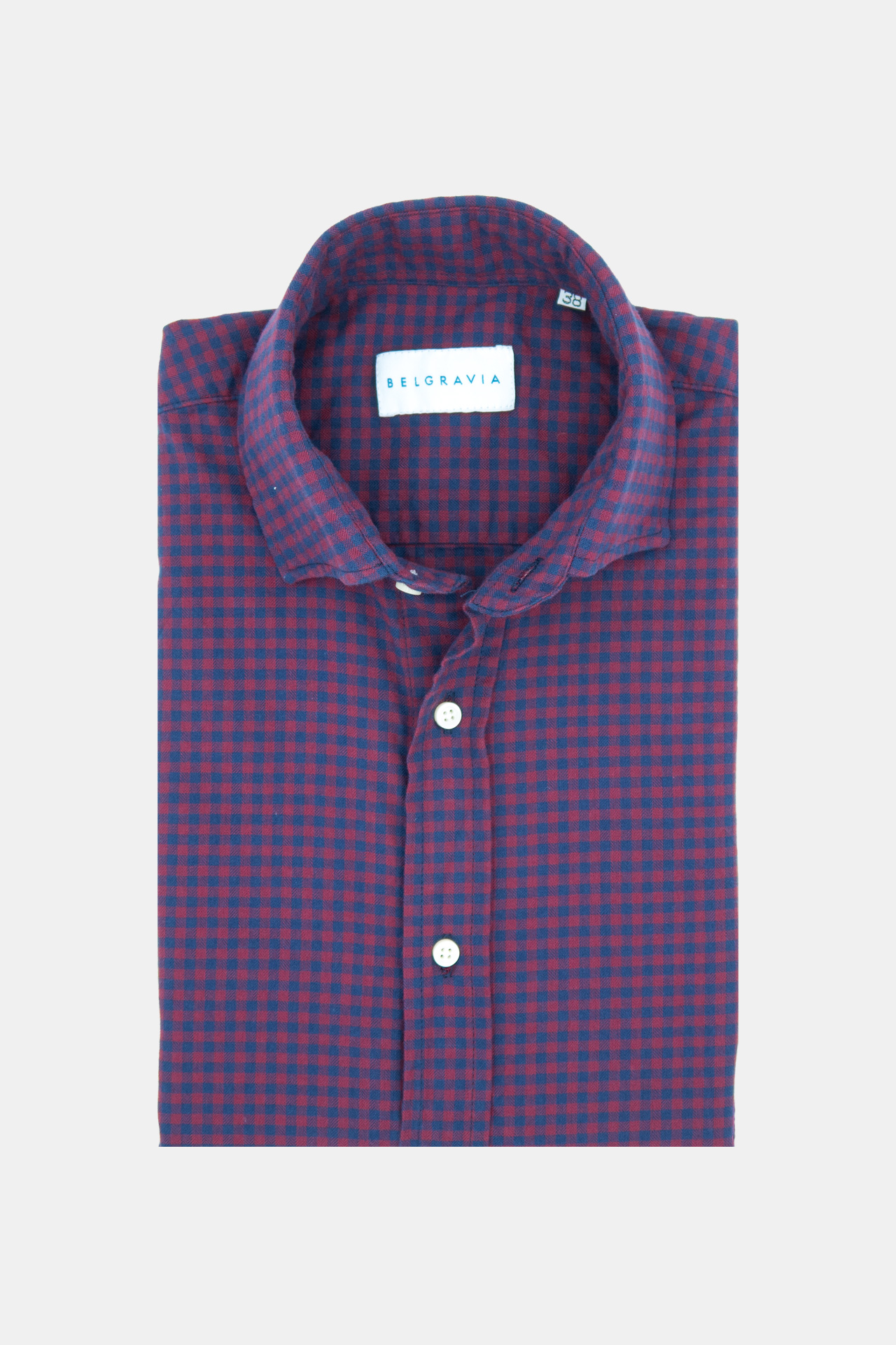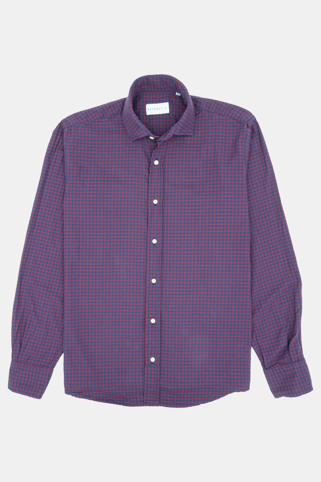 Camisa de manga larga de algodón con cuadros granate y azul de corte recto con dos pequeñas pinzas en la espalda. El puño es ajustable con dos botones. El diseño del cuello es tipo italiano.