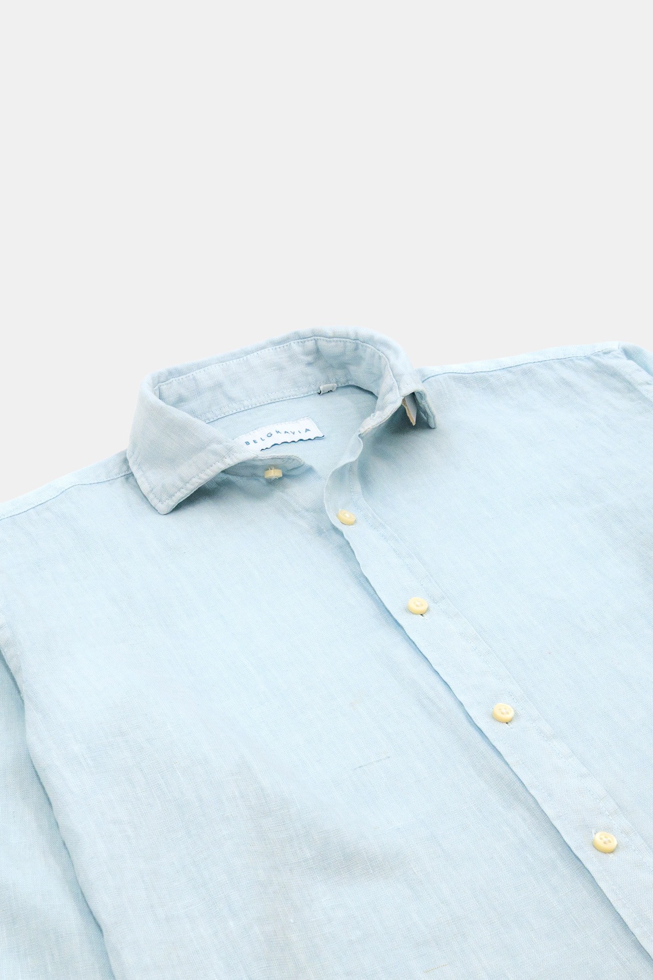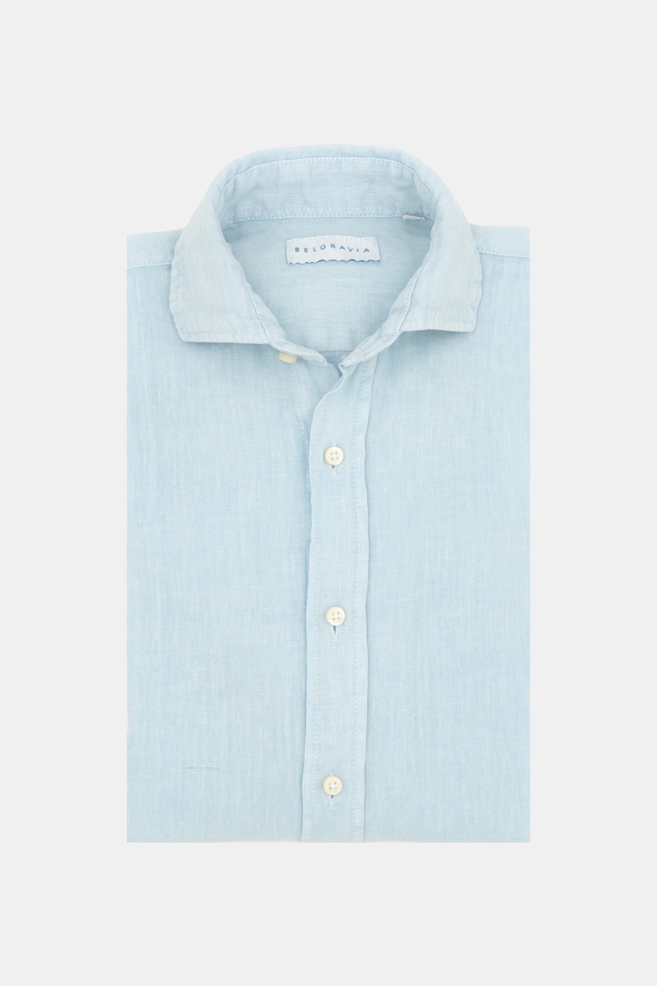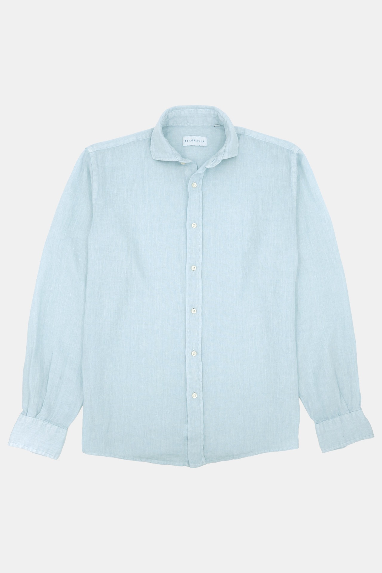 Camisa de manga larga de lino color celeste. Corte recto, cuello tipo italiano y 2 botones en los puños para abrochar a medida.