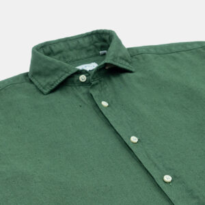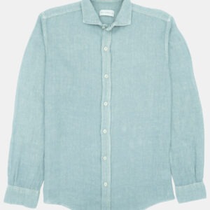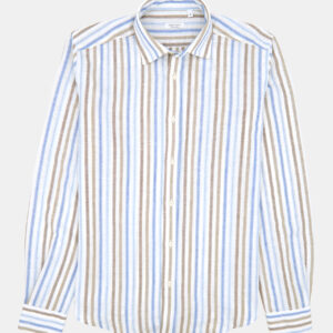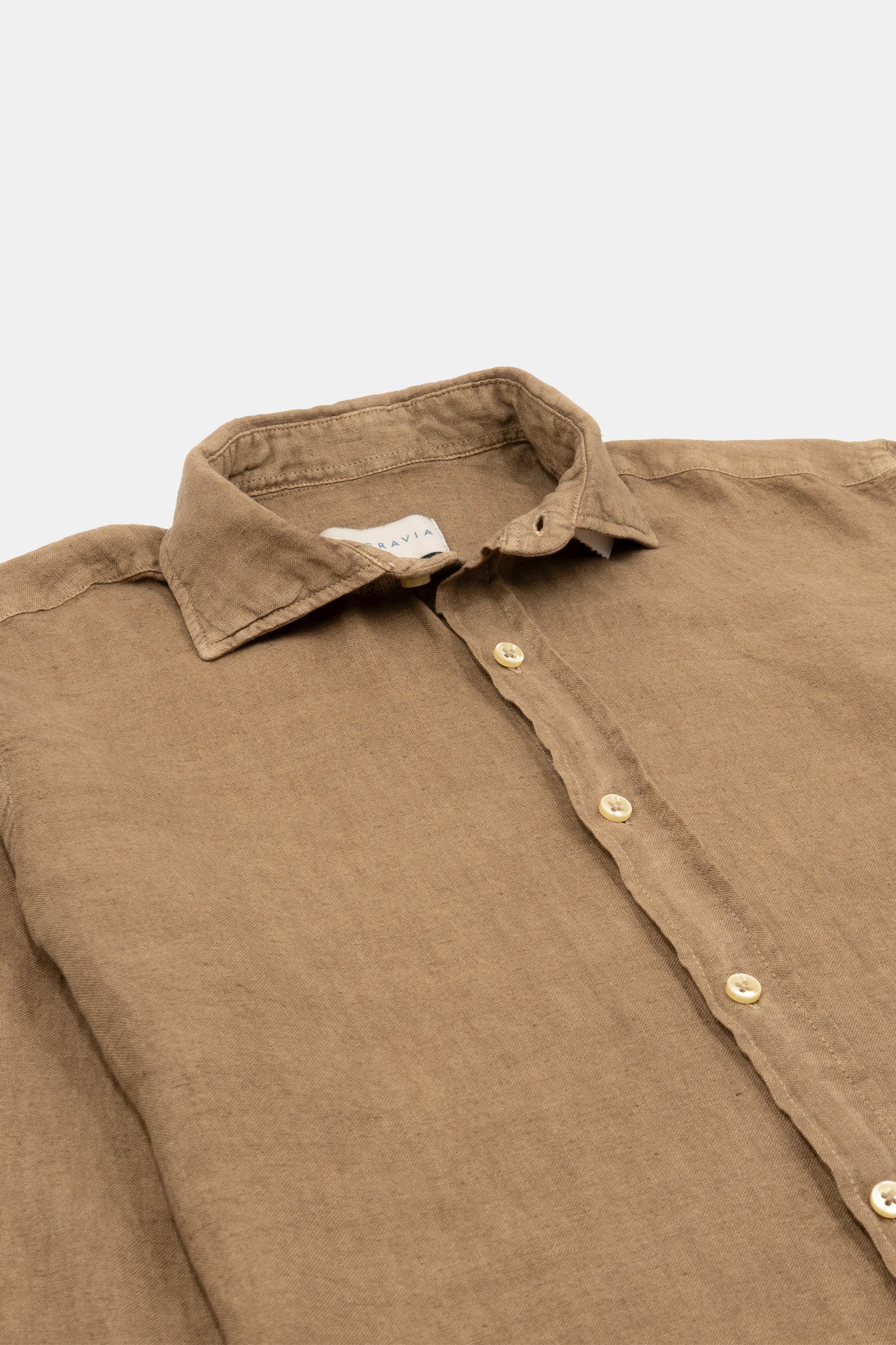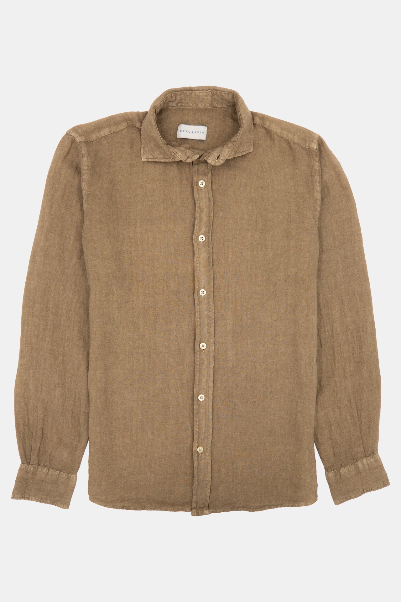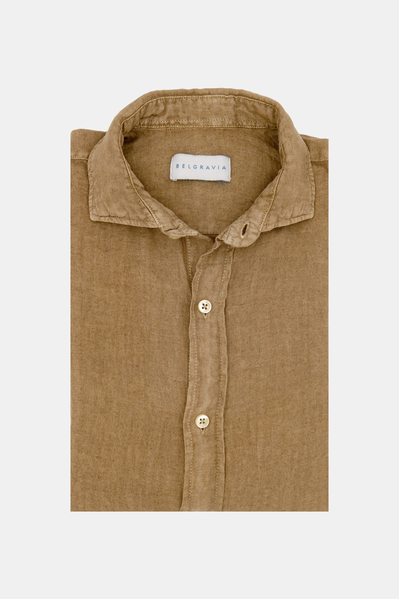 Camisa de manga larga de lino color tabaco. Corte recto, cuello tipo italiano y 2 botones en los puños para abrochar a medida.