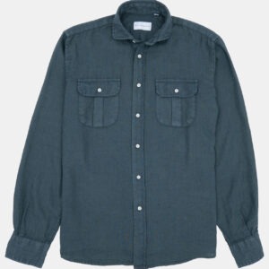 Camisa de manga larga de lino color azul claro. Corte recto, cuello tipo italiano y 2 botones en los puños para abrochar a medida. Consta de dos bolsillos frontales con tapa y botón.