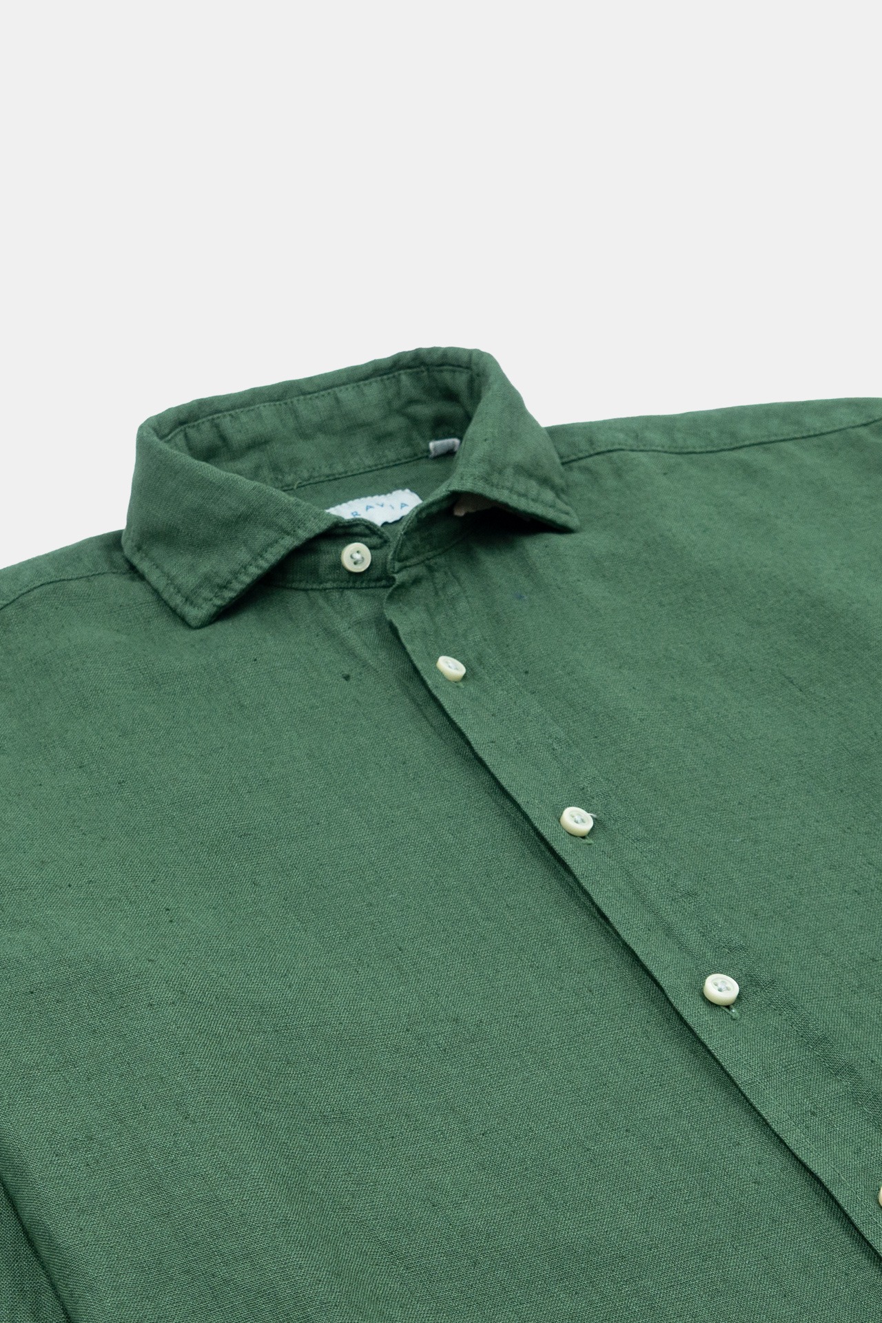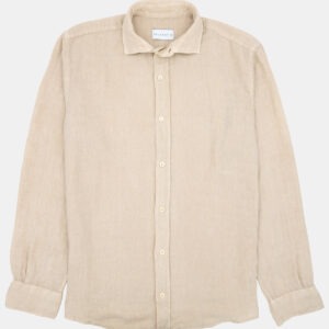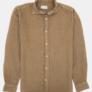 Camisa de manga larga de lino color verde. Corte recto, cuello tipo italiano y 2 botones en los puños para abrochar a medida.