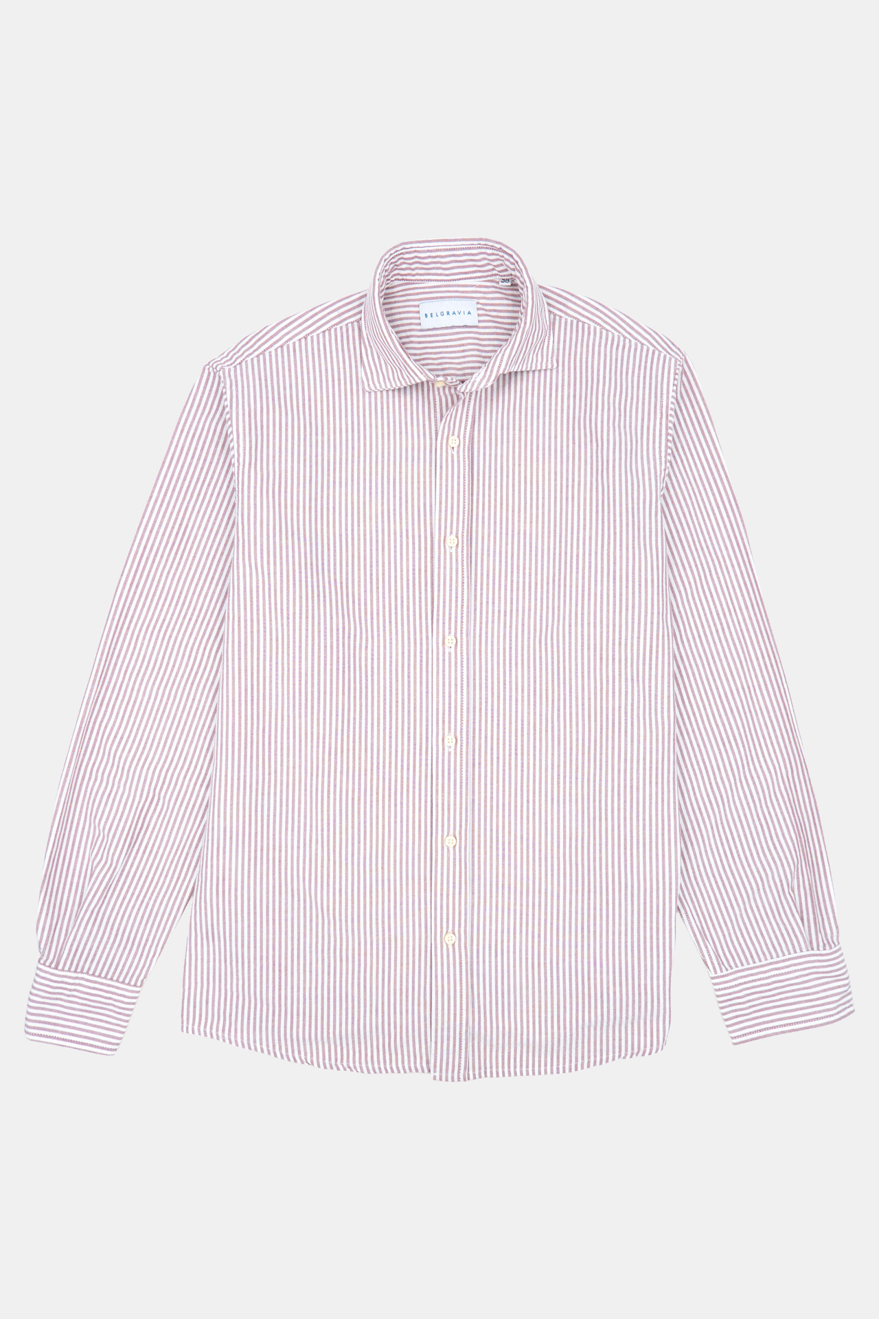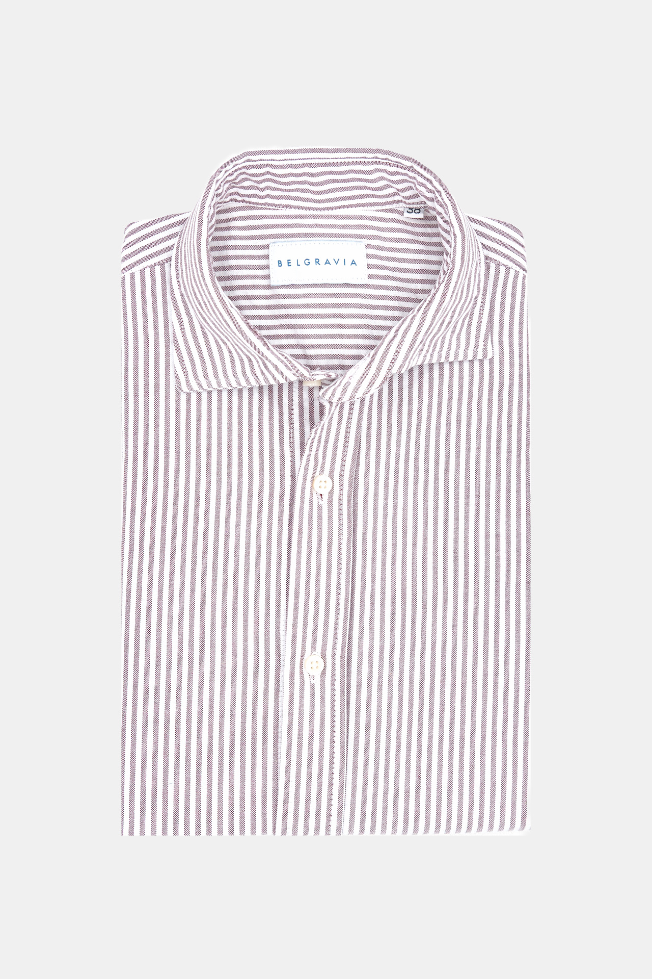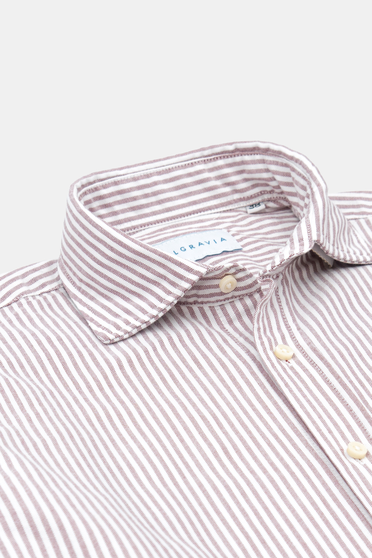 Camisa de manga larga de algodón con tejido oxford de rayas rojas. El puño es ajustable con dos botones. El diseño del cuello es tipo italiano.
