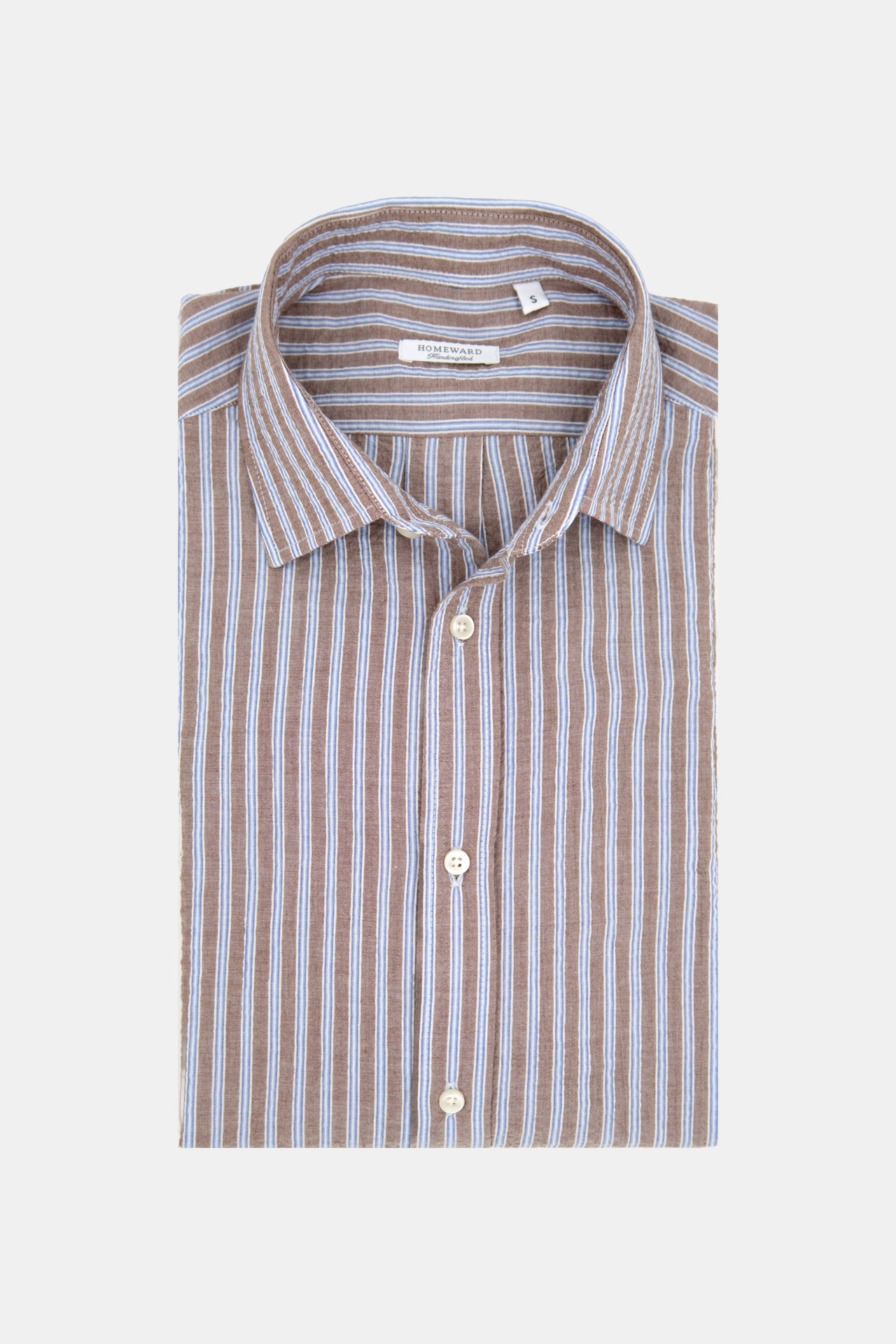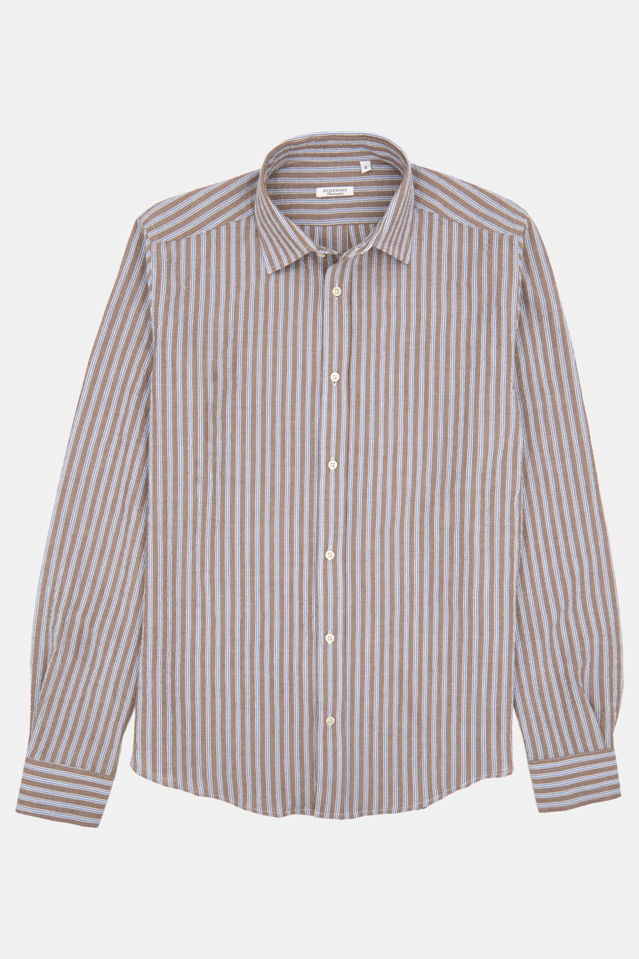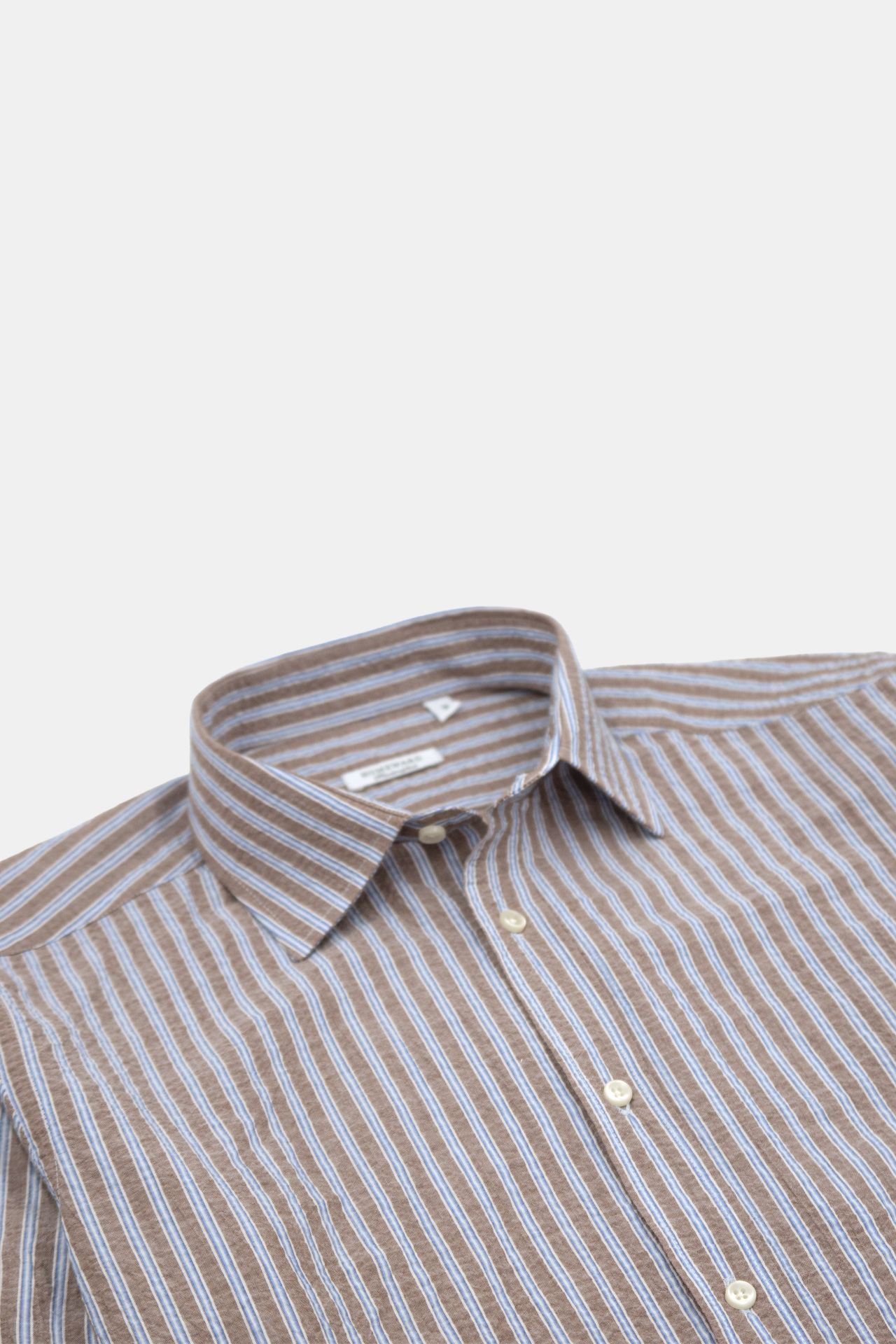 Camisa de manga larga de rayas marrones  confeccionada en un tejido de tacto rugoso y fresco, seersucker, de  algodón.  Diseño recto y cuello italiano.