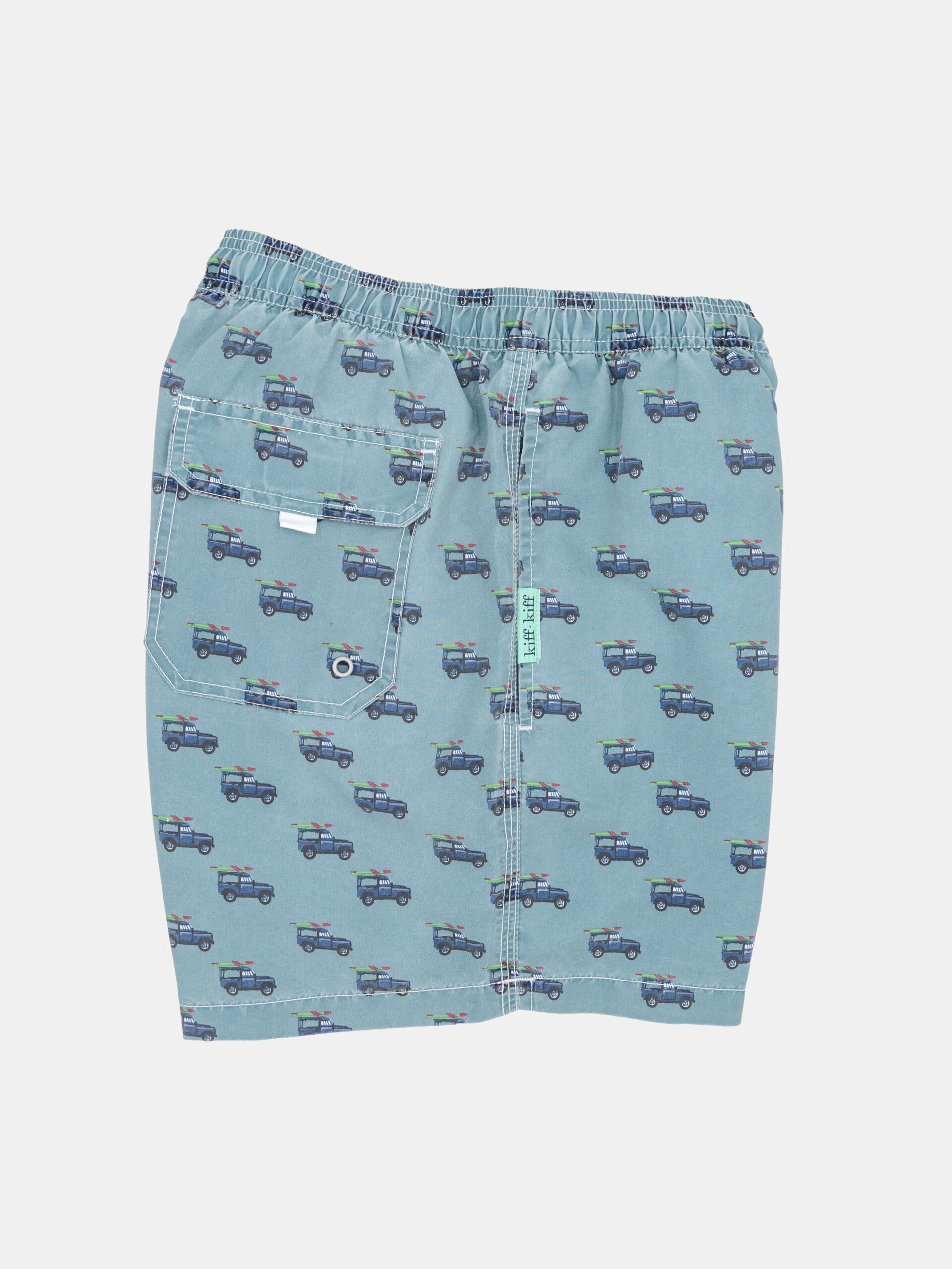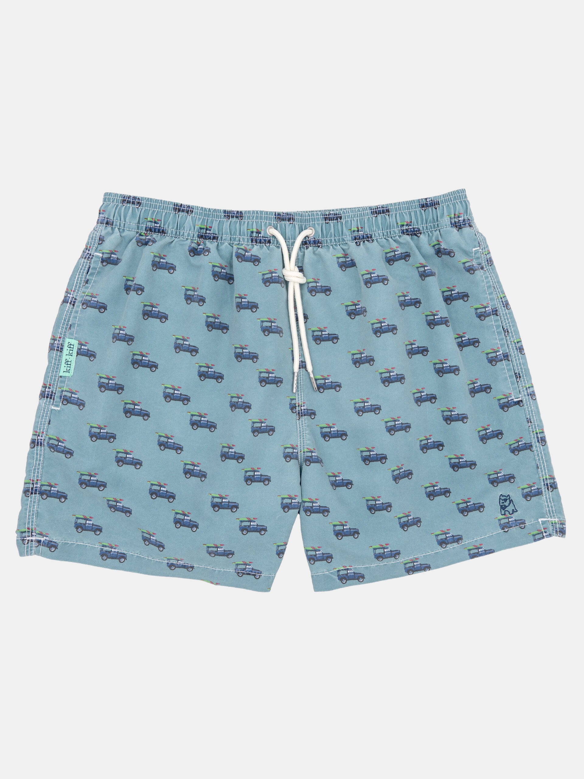 Traje de baño con efecto lavado en color azul con coches. Teñido con pigmentos naturales.