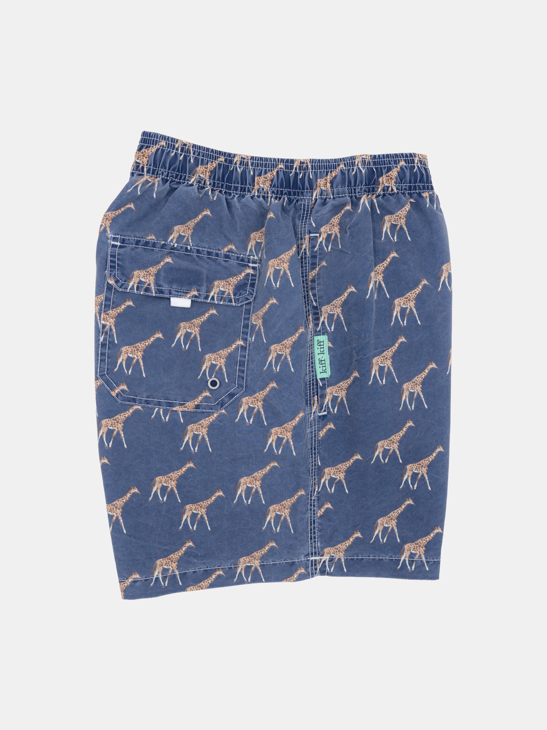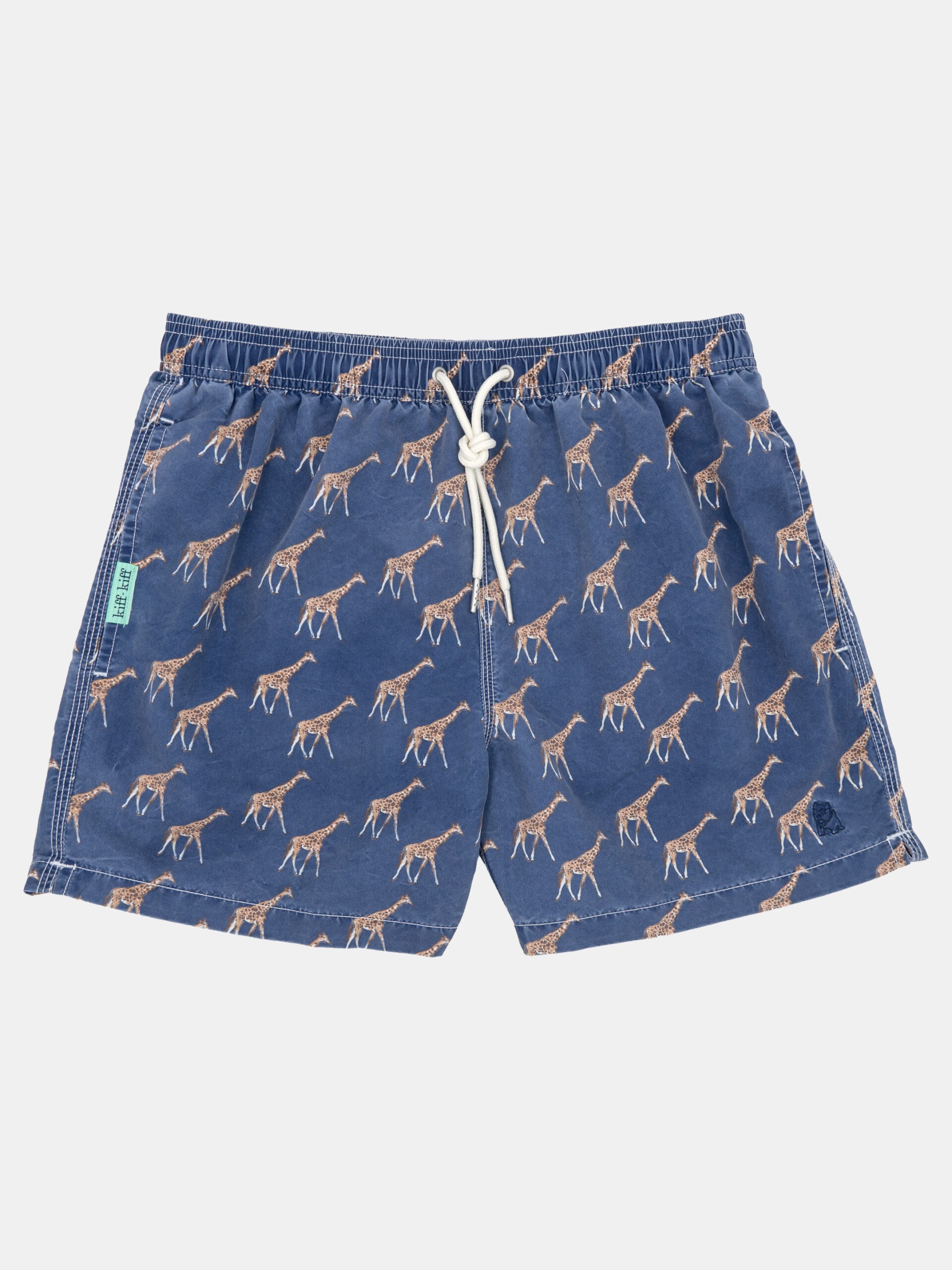 Traje de baño con efecto lavado en color azul con estampado de jirafas. Teñido con pigmentos naturales.