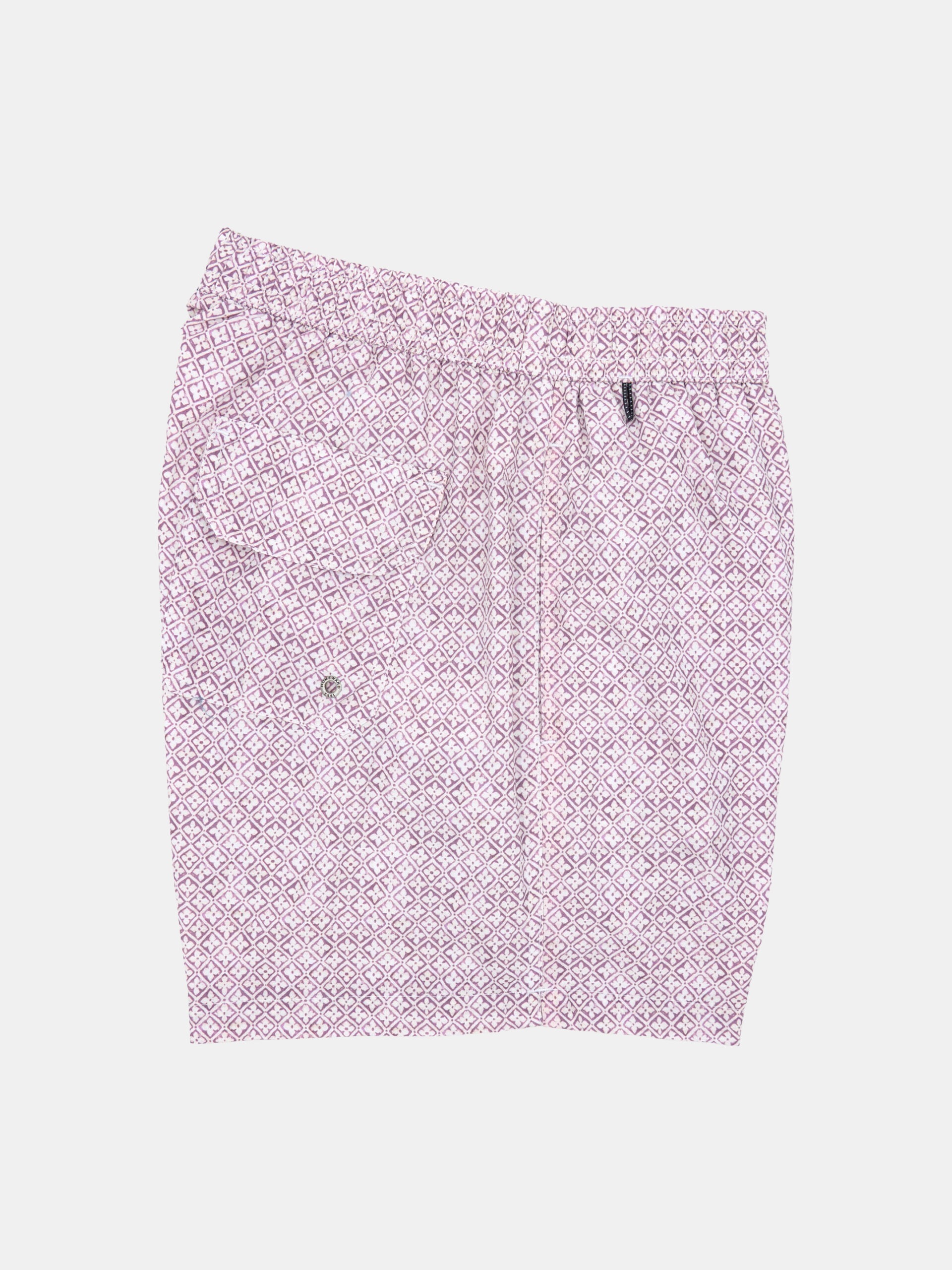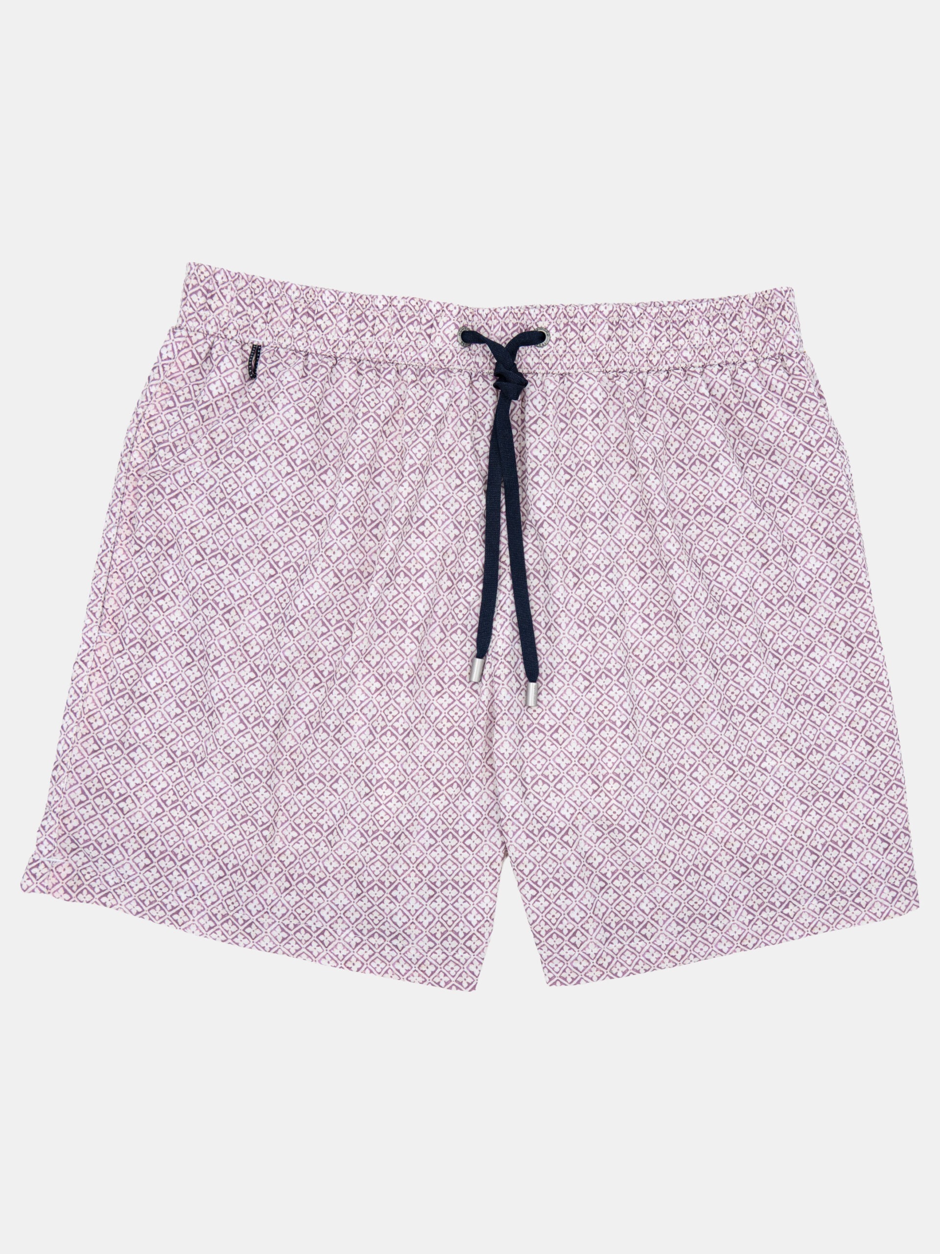 Traje de baño de secado rápido con estampado típico de la India en color malva, tiene bolsillos a los lados y un bolsillo trasero con ojal para drenaje.