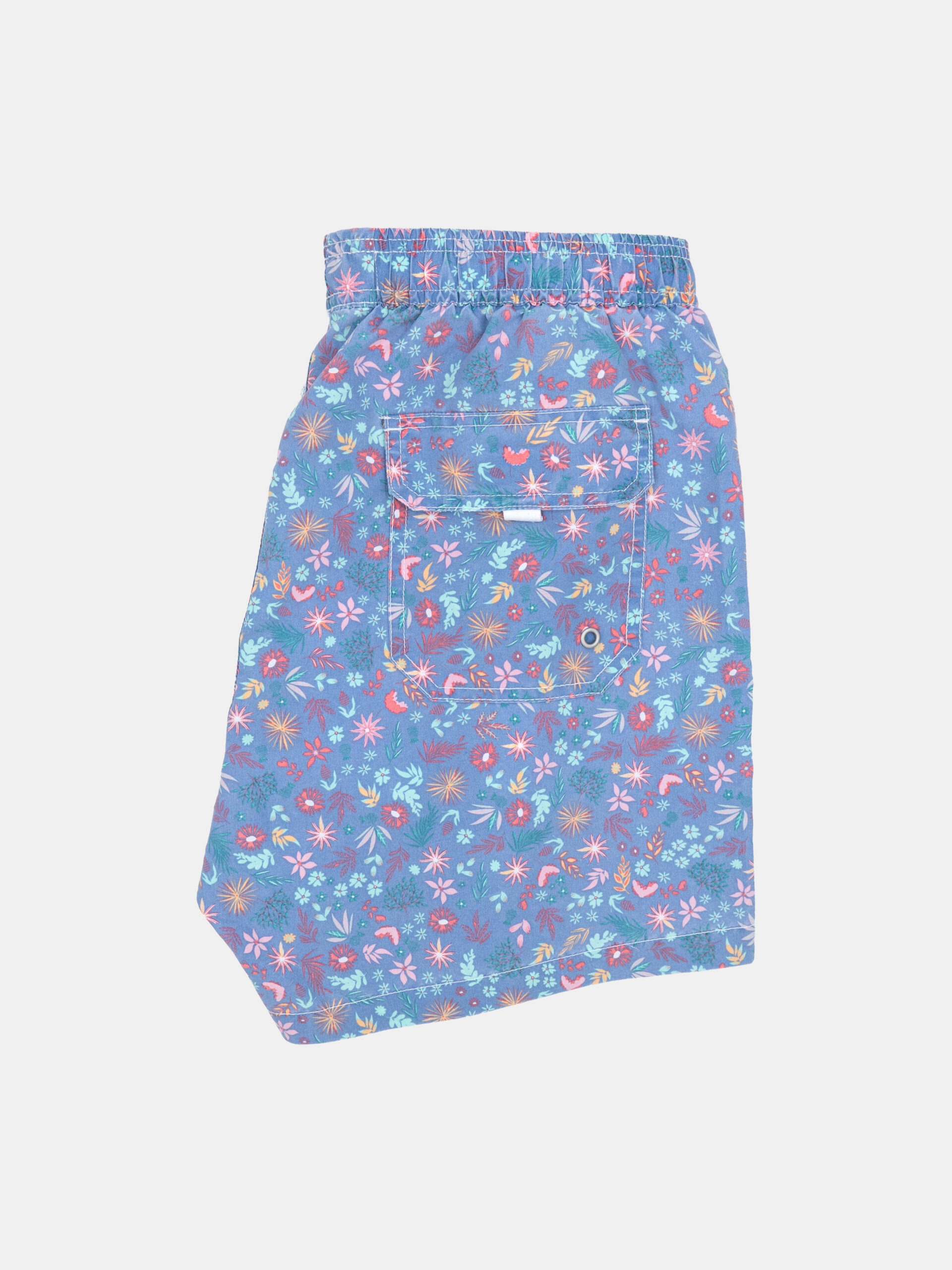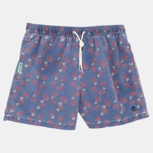 Traje de baño con efecto lavado en color azul con dibujos florales. Teñido con pigmentos naturales.