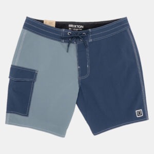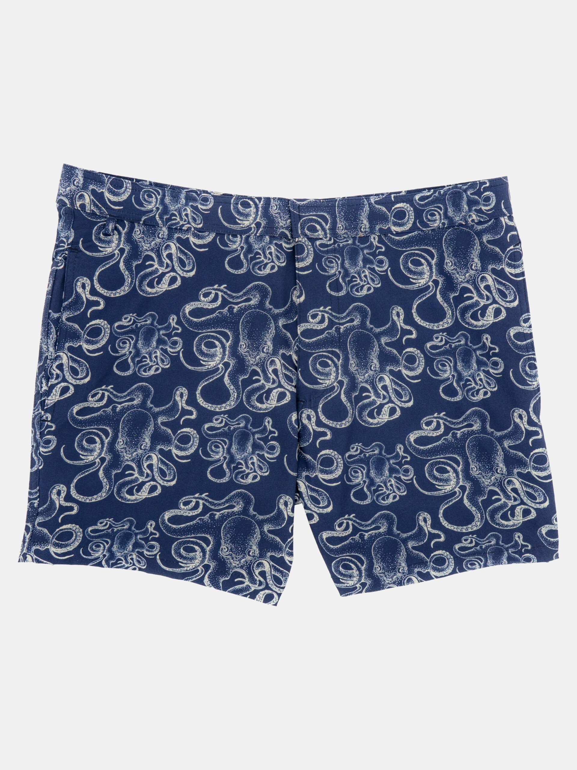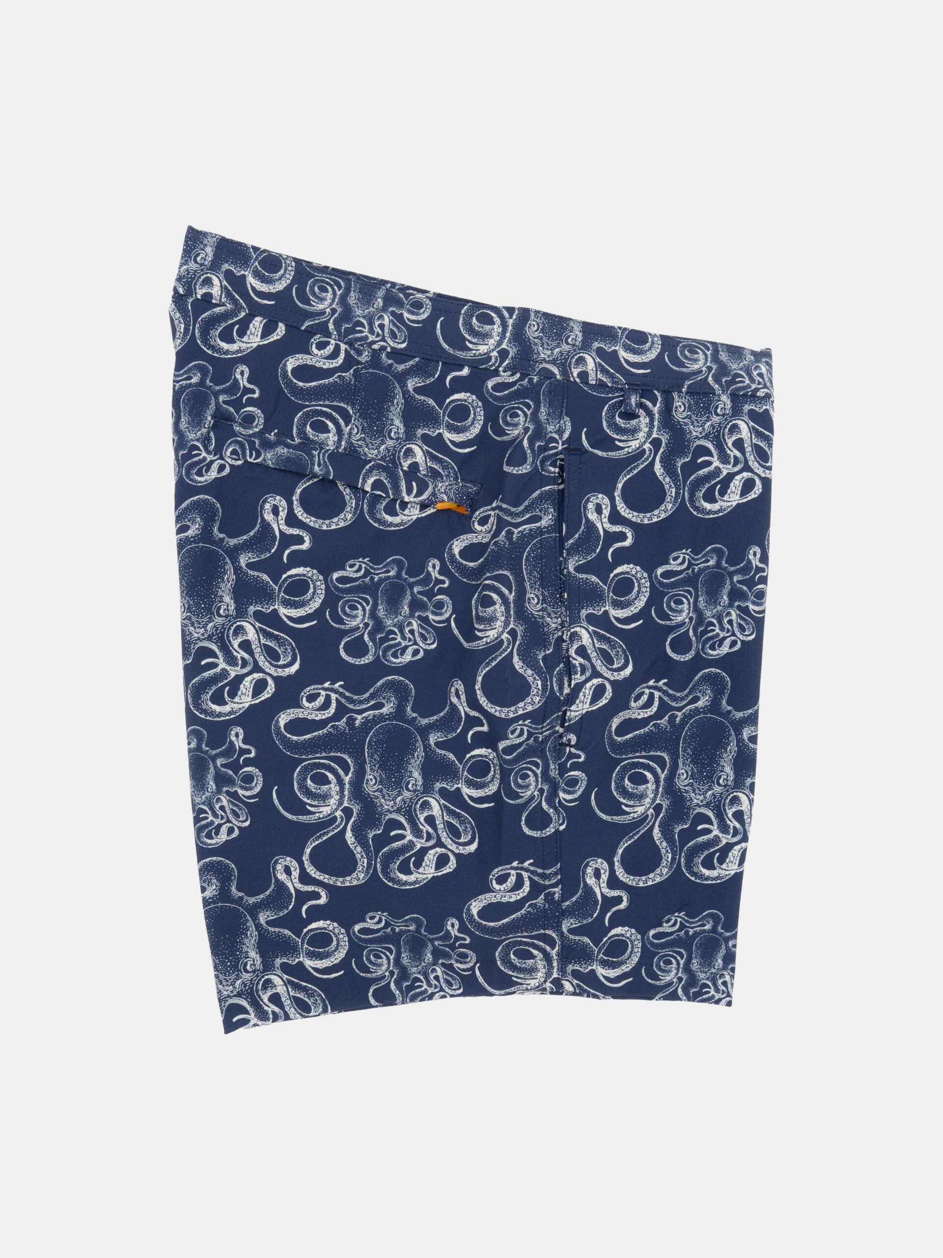Traje de baño de secado rápido con estampado de pulpos sobre fondo azul, tiene bolsillos a los lados y un bolsillo trasero con ojal para drenaje.