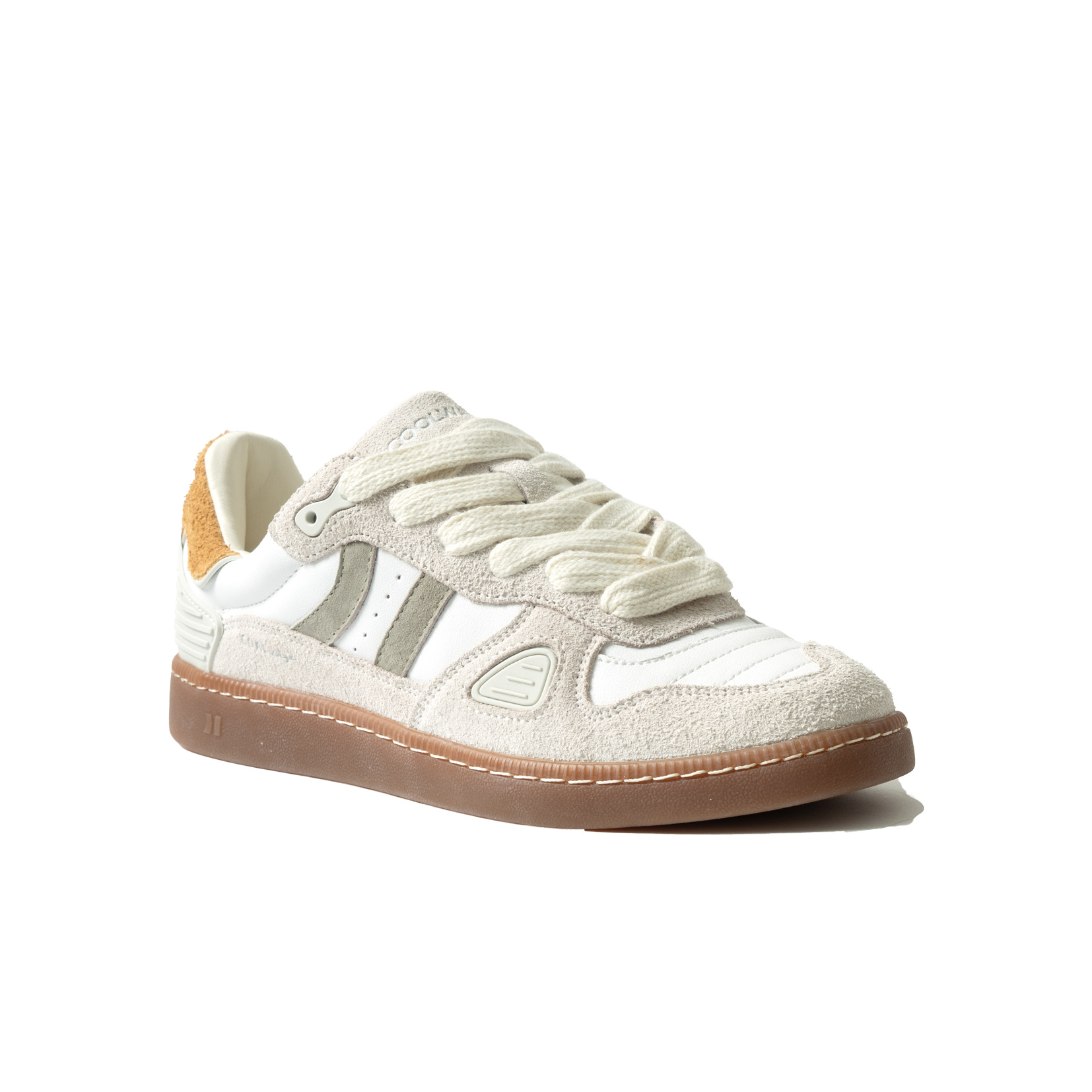 Zapatilla de serraje y piel. Horma ancha. Parte delantera reforzada. Suela flexible de goma/caucho. Color blanco y raya verde caqui, refuerzo talón caucho y serraje mostaza.