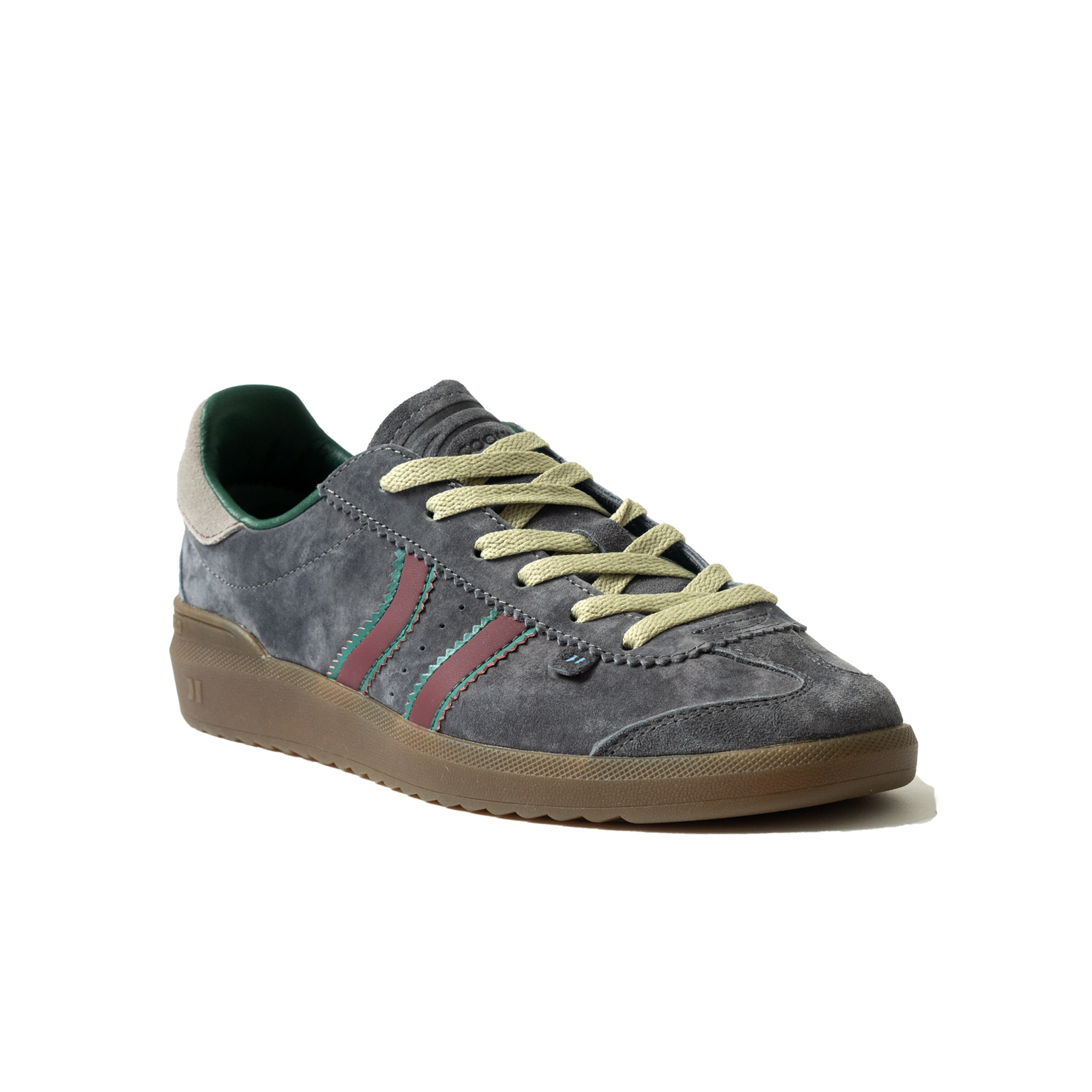 Zapatilla de serraje.  Parte delantera reforzada. Suela flexible de goma/caucho. Color gris azulado y raya burdeos con pespunte verde y refuerzo talón piel gris clarito.