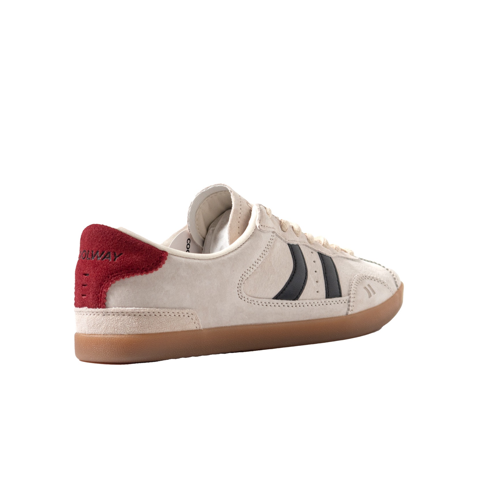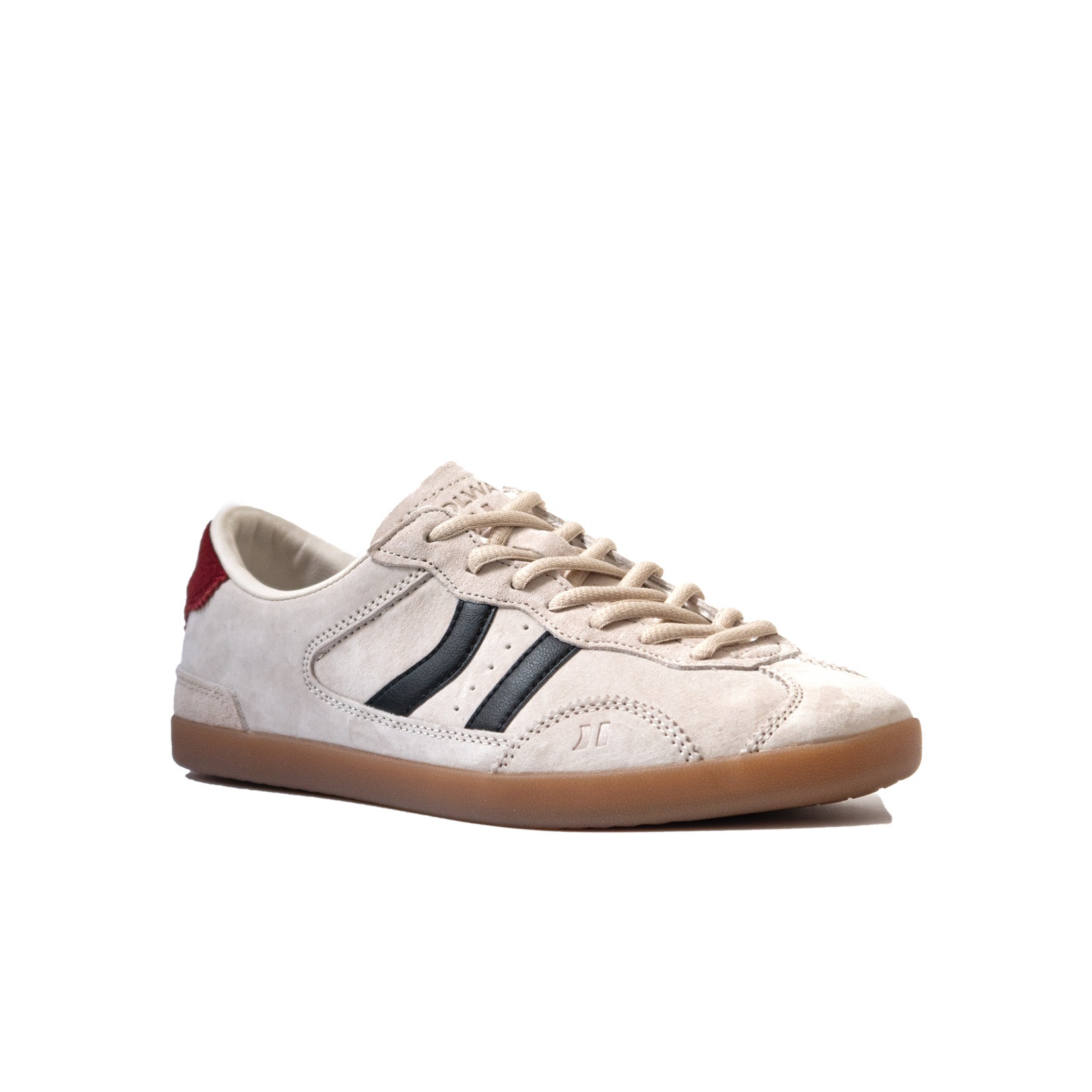 Zapatilla baja de serraje en el exterior y la lengüeta y piel en el interior. Cuello acolchado.La pieza del talón y el logo contrastan en color y textura. La suela de goma lleva un pespunte en la base para reforzar.