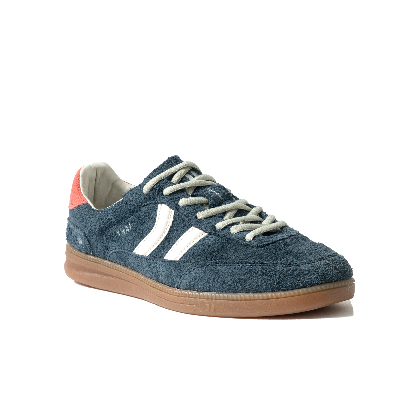 Zapatilla de serraje.  Parte delantera reforzada. Suela fina de goma/caucho. Color azul marino y raya blanca y refuerzo talón piel fresa.